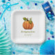 Plaques en papier citrouilles pour la fête de Thanksgiving. L'exemple de texte est "Dîner d'action d'amitié" avec la date de l'année. Choisissez des assiettes carrés ou rondes pour votre rassemblement. Les assiettes en papier de vacances sont parfaites pour servir des desserts.