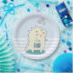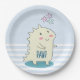 Plaques en papier avec un mignon dinosaure souriant, joues roses et RAWR écrit sur son ventre. 3 étoiles joyeuses et colorées au-dessus de sa tête. Placé sur un motif bleu clair et blanc de pois et rayures.