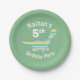 Dinosaure rayé vert et bleu de bande dessinée des plats customisés de fête d'anniversaire de l'enfant mignon.