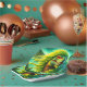 Ces plaques en papier ont un dinosaure vert sur elles.