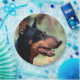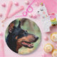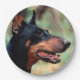 Léger effet de dessin animé sur cette image d'un chien Doberman Pinscher avec des oreilles rognées contre un jeu de couleurs arrière - plan vert boisé. Parfait pour l'amoureux des chiens Dobie en vous !