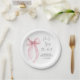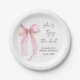 Élégantes assiettes en papier pour la douche de la mariée avec une aquarelle représentant un nœud coquet rose clair, la phrase « Elle va se marier » dans un script calligraphié, et le nom de la mariée et la date de la fête dans une typographie moderne simple.