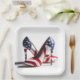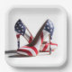 Des chaussures à talons hauts au design inspiré du drapeau américain sont positionnées contre un arrière - plan blanc clair