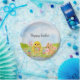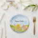 Bright spring colors and playful charm decorate these watercolor Easter paper plates, featuring a fluffy baby chick carrying a basket of colorful Easter eggs while a friendly bunny in a pink bowtie keeps watch nearby. Surrounded by blooming pastel tulips, the cheerful design captures the joyful spirit of the season, adding a festive and whimsical touch to Easter brunches, egg hunts, and spring celebrations.