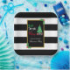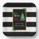 Eat, drink and be merry holiday party featuring a Christmas tree and gifts against a gold frame. Black and white striped background with holly