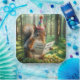 Un écureuil se tient dans une forêt éclairée par le soleil, portant un casquette de fête festif tout en tenant une carte d'anniversaire.