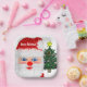 Joyeux Noël est écrit dans une typographie blanche festive à travers Père Noël casquette de fureur blanc rouge. Jolly Santa Claus aux joues roses, yeux bleus, barbe blanche, gros nez rouge et casquette blanc rouge. Un sapin de Noël à l'ancienne décoré dans l'arrière - plan avec un homme en pain d'épices, des sucres de canne, des ornements et une étoile jaune sur le dessus. Oeuvre originale © 2013, 2015 TamiraZDesigns.