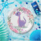 J'espère que vous apprécierez ce dinosaure violet et rose avec un papillon rose au nez et des fleurs botaniques. Des produits correspondants et des invitations à des correspondances sont disponibles.
