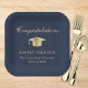 Élégante plaque de papier bleu de la fête de graduation avec un casquette de grade d'or, "Félicitations" dans un script classique et le nom du diplômé, l'école et l'année de classe dans la typographie moderne.