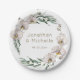 Personalized wedding paper plate depicts a watercolor floral wreath design with elegant white orchids and greenery. It features names and date and can be customized to the details of your choice.*