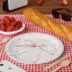 Élégant blush rose nœud assiettes en papier parfait pour les baby showers ou les douches de mariée.
