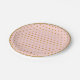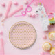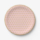 Belle plaque en papier avec élégants pois dorés encadrés d'un cercle doré sur arrière - plan rose. Idéal pour toutes les célébrations.
