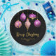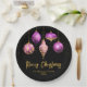 Celebrate the season with striking sophistication. This purple and gold Christmas party plate features five hanging ornaments - each uniquely styled with glittering stars, snowflakes, florals, and harlequin patterns. Set against a deep black background with golden sparkles, it brings a luxurious, modern twist to your holiday table. Perfect for festive gatherings, office parties, or upscale winter events.