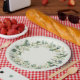 D'élégantes assiettes mariages crème avec des neiges peintes à la main et des eucalyptus disposées en une belle couronne botanique. Autres couleurs et éléments de coordination disponibles.