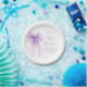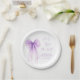 Élégantes assiettes en papier pour la douche de la mariée avec un nœud violet aquarelle, "elle noue le nœud" mis en valeur dans une écriture calligraphique violette, et le nom de la mariée et la date de la douche dans une simple écriture violette.