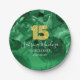 Célébrez votre élégante Quinceañera verte avec une plaque de papier vert personnalisée. La parties scintillant dorée numéro 15 est belle sur l'arrière - plan rose vert. L'élégante assiette de fête personnalisée Quinceanera verte est polyvalente pour les thèmes jade, émeraude, vert turquoise ou St. Patrick.