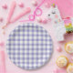 Modifiez la couleur arrière - plan violet pâle derrière la tuile sans couture en vichy à damiers motif. Ajoutez du texte pour créer vos propres plaques de papier personnalisées. La motif traditionnelle en vichy ajoute une touche de charme et de nostalgie à tout événement spécial. Ces assiettes sont idéales pour un baby shower, un pique-nique familial, des barbecues ou tout rassemblement extérieur où l'on souhaite une atmosphère décontractée et joyeuse. Ils peuvent également être intégrés à un mariage vintage ou d'inspiration nationale.