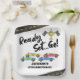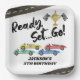 Boys course voiture d'anniversaire plaques en papier avec un arrière - plan blanc simple, 4 voitures de course aquarelle, routes, drapeaux à damiers, un trophée, le titre "prêt, set...allez !", et le nom et l'âge des enfants.