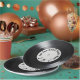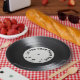 Un disque vinyle noir classique avec un étiquette vierge et brillant brillant pour une fête. Le texte peut être modifié.