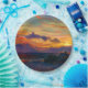 Un design artistique d'un beau coucher de soleil montrant également des rochers, la plage et un homme de pêche.