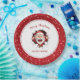Jolie plaque de papier rond de Noël avec le Père Noël amusant se briser. Bordures rouges enneigées. Personnalisez facilement le texte. - Kate Eden Art.