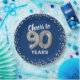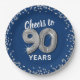 Élégantes plaques de papier de fête de quatre-vingt-dixième anniversaire avec un arrière - plan bleu tendance qui peut être changé à n'importe quelle couleur, parties scintillant brillante argent, et le dicton "encourage à 90 ans" en utilisant quatre-vingt-dix ballons d'hélium argent.
