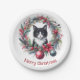Si vous aimez les chats et Noël, vous aimerez ce design sur les plaques en papier. Il est orné d'un mignon chaton noir et blanc assis dans une couronne de décorations de Noël. La couronne est faite de branches de pins, de fleurs rouges et d'ornements. Ce design est parfait pour les amoureux de les chats et est parfait pour les vacances.