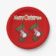 Voici une idée de planification de fête de Noël pour vos assiettes en papier. Ce dessin comporte une photographie en double d'un bas rouge et vert avec un bonhomme de neige adorable habillé d'un foulard et d'un casquette en plaid de saison placé sur un arrière - plan rouge. Cliquez sur personnaliser pour ajouter du texte comme un nom.