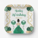 Cette invitation à l'assiette d'anniversaire comprend un cadre doré élégant, une belle princesse aux cheveux bruns et une robe verte, des fleurs et un ballon. C'est parfait pour une fête d'anniversaire.