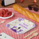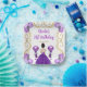Cette invitation à l'assiette d'anniversaire comprend un cadre doré élégant, une belle princesse aux cheveux bruns et une robe violette, des fleurs et un ballon. C'est parfait pour une fête d'anniversaire.
