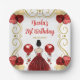 Cette invitation à l'assiette d'anniversaire comprend un cadre doré élégant, une belle princesse aux cheveux bruns et une robe rouge, des fleurs et un ballon. C'est parfait pour une fête d'anniversaire.