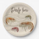 Assiettes en papier pour fête de fruits de mer avec motif de crevettes et texte personnalisé en haut. Utiliser pour les célébrations d'anniversaire, les rassemblements estivaux ou les barbecues annuels à la plage. Les couleurs et le texte sont unisexes et les assiettes sont disponibles en deux tailles.
