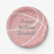 Ces plaques de papier amusantes de basket-ball anniversaire de fête comportent un graphique minimaliste de basket-ball (représenté uniquement par les coutures de basket en blanc) surplombant une texture créative chic et rose numériquement sur laquelle vous pouvez customiser le texte dans n'importe quelle couleur personnalisée - par katz_d_zynes