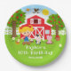 Cette assiette mignonne et amusante présente une fille aux cheveux blonds et à la peau claire à côté d'une grange rouge avec une girouette en forme de coq. Il y a des animaux de ferme adorables tels qu'une vache, un cochon et une poule. En arrière-plan, on voit un ciel bleu vif, des pommiers, du soleil, des papillons et des marguerites. Le texte combine des polices grasses et sans serif pour un look stylé et moderne. C'est parfait pour une fête d'anniversaire sur le thème de la ferme.