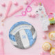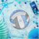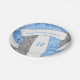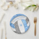 Ces plaques personnalisées de volleyball anniversaire de fête d'anniversaire sont illustrées par l'image d'un volleyball stylisé avec des panneaux bleu clair, gris et blanc, sur lesquels vous pouvez customiser votre texte - les panneaux bleu et gris du volleyball sont mélangés avec un joli motif kaléidoscopique floral pour une apparence texturée qui est artistique et girly - par katz_d_zynes