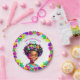 Jolie petite fille de couleur avec des fleurs jaunes, violettes et roses dans ses cheveux. Ajoutez un nom dans la zone personnalisée. Plaques de papier fête d'anniversaire.