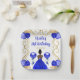Cette invitation à l'assiette d'anniversaire comprend un cadre doré élégant, une belle princesse à la peau foncée et une robe bleue royale, des fleurs et un ballon. C'est parfait pour une fête d'anniversaire.