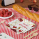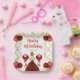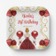 Cette invitation à l'assiette d'anniversaire comprend un cadre doré élégant, une belle princesse aux cheveux rouges et une robe rouge, des fleurs et un ballon. C'est parfait pour une fête d'anniversaire.