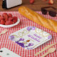 Cette invitation à l'assiette d'anniversaire comprend un cadre doré élégant, une belle princesse aux cheveux rouges et une robe violette, des fleurs et un ballon. C'est parfait pour une fête d'anniversaire.