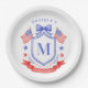 Cette conception de plaque en papier pour fête de mariage patriotique présente un blason à l'aquarelle avec un blason patriotique rouge clair et bleu avec des drapeaux américains et un nœud bleu. Vous pouvez personnaliser avec votre monogramme et nom.