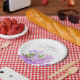 Assiette en papier simple et élégante pour fête de mariage avec fleur de géranium violet rose et texte en calligraphie vibrante.