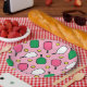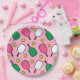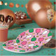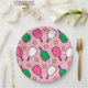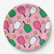 Assiettes créatives pour fête ou événement de pickleball avec motif de palettes rose chaud et vert frais et balles jaunes sur fond rose pour vos joueurs de pickleball préférés.