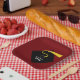Assiettes créatives pour fête ou événement de remise de diplôme pour les diplômés de la promotion '26 avec une ligne drôle et une casquette de graduation noire classique avec un gland doré sur fond marron.
