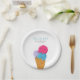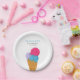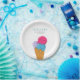 Plaque de papier pour la fête d'anniversaire du thème de la crème glacée mignonne avec illustration d'une crème glacée colorée sur un cône gaufre aux couleurs rose, bleu, violet. Idéal pour une fête d'enfants en été.