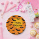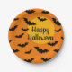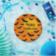 Bats orange et noirs personnalisés Plaques de papier de fête Halloween. Ajoutez votre propre salutation de vacances heureuse personnalisée. Fournitures Éffrayantes, décorations et accessoires jetables jetables pour les soirées costumées, les astuces ou les friandises, les soirées, les barbecues, les dîners, les anniversaires, les mariages etc. Disponibles en petits et grands. Changez la quantité pour obtenir le prix en vrac bon marché. Convient aux hommes, aux femmes et aux enfants. Pleine lune avec modèle de texte élégant.