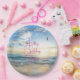 Assiettes en papier pour fête sur mesure avec texte au centre et image de scène de plage. Un lever de soleil sur l'océan avec des vagues sur le rivage et des oiseaux qui volent est l'image sur des assiettes en papier rondes ou carrées. Un texte rose fuchsia vif au centre peut être personnalisé pour un anniversaire, des félicitations, une remise de diplôme ou tout événement. Une police moderne avec une première lettre extra-large est utilisée. Personnalisez avec le nom de la personne honorée.