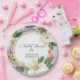 "Assiette en papier pour la douche de mariée Feuille de magnolia blanche aquarelle florale bleue poussiéreuse." Ravissant pour une douche de mariée de printemps, d'été ou d'automne. Bordure bleue ardoise poussiéreuse douce avec des fleurs de magnolia blanches mélangées à des fleurs sauvages roses, des roses roses, une couronne de branches de brindilles et un feuillage vert et brun pour un thème de design naturel BOHO. Peinture réalisée par l'artiste et designer agréée internationalement, Audrey Jeanne Roberts, copyright.