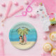 Hawaiian Surfer Girl Ce design de beauté de l'île ensoleillée et lumineuse présente une jolie fille hawaïenne et sa planche de surf à fleurs roses. L'océan appelle cette petite fille, car elle est prête à surf les vagues de l'île sur cette belle plage ensoleillée. Ce thème d'île tropicale est le design parfait pour votre petit luau et hula d'anniversaire.