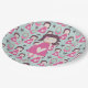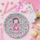 Filles et sacs à main autocollants de conception, ornements, cartes, coussins, horloges murales, ouvre-bouteilles, planches à découper, carnets, montres, portefeuilles, planches à effacement sec, et beaucoup d'autres objets avec un design mignon avec des filles en robes de coeur rose, poches potées roses et blanches, étoiles violettes profondes, et un arrière - plan rayé de chevron bleu.