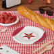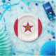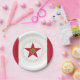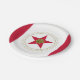 Paper plate with flag of city of Birmingham, Alabama; flag with three vertical bands of red and white with city seal with a star in the center